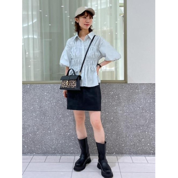 비스체풍의 셜링을 한 컴팩트한 셔츠에 가죽 스커트를 맞춘 캐주얼 코데입니다.